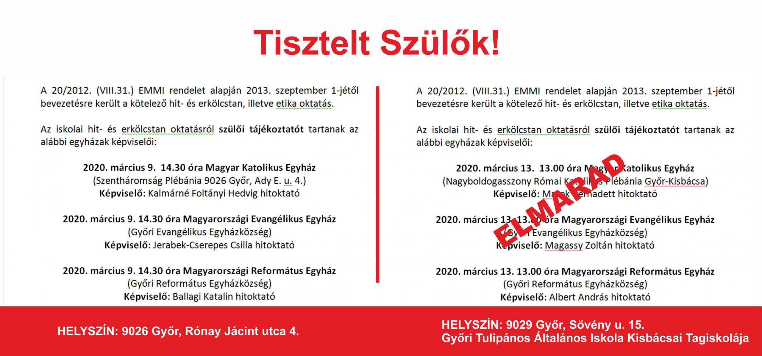 2020.03.09.Az iskolai hit- és erkölcstan oktatásról szülői tájékoztatót tartanak az alábbi egyházak képviselői: