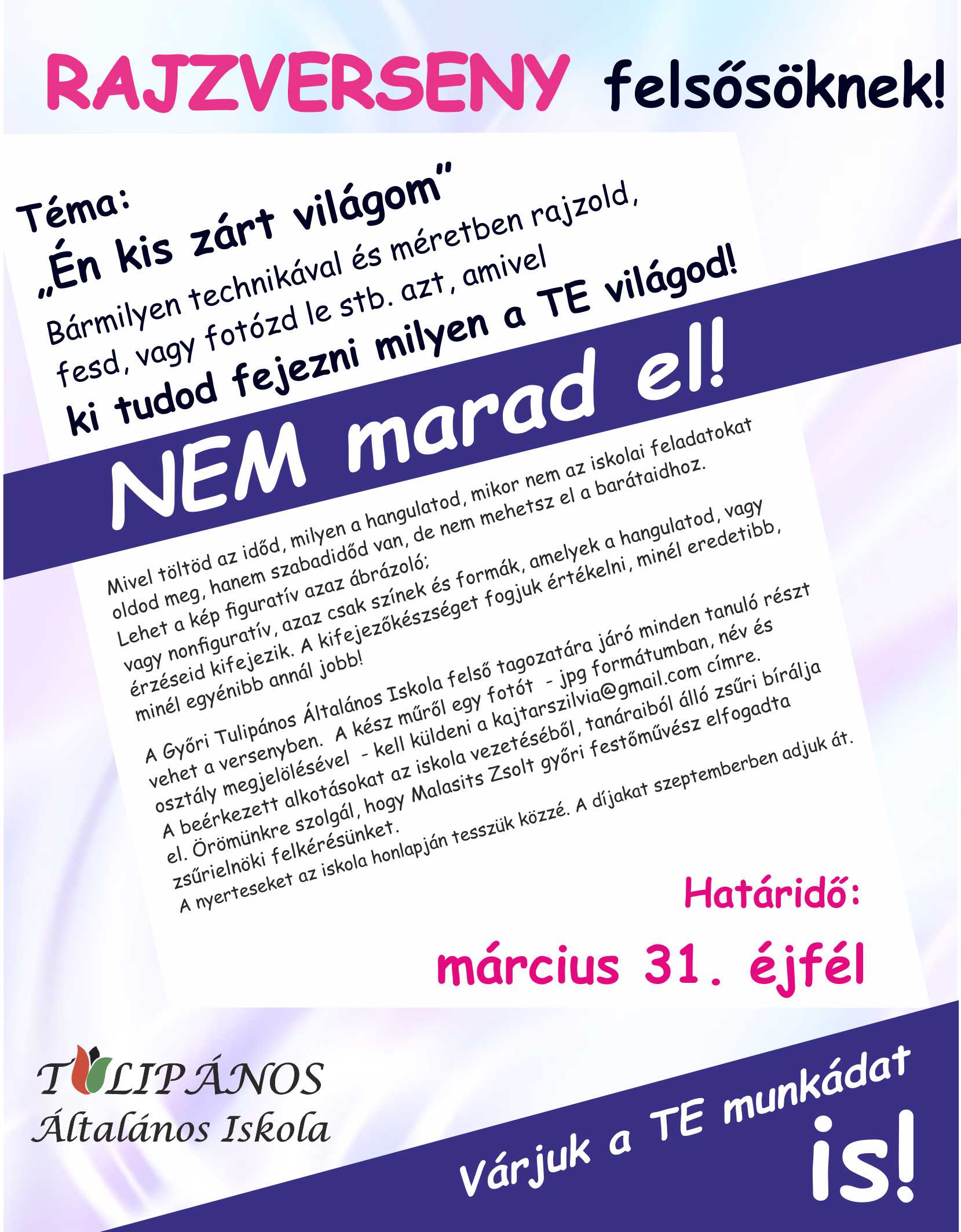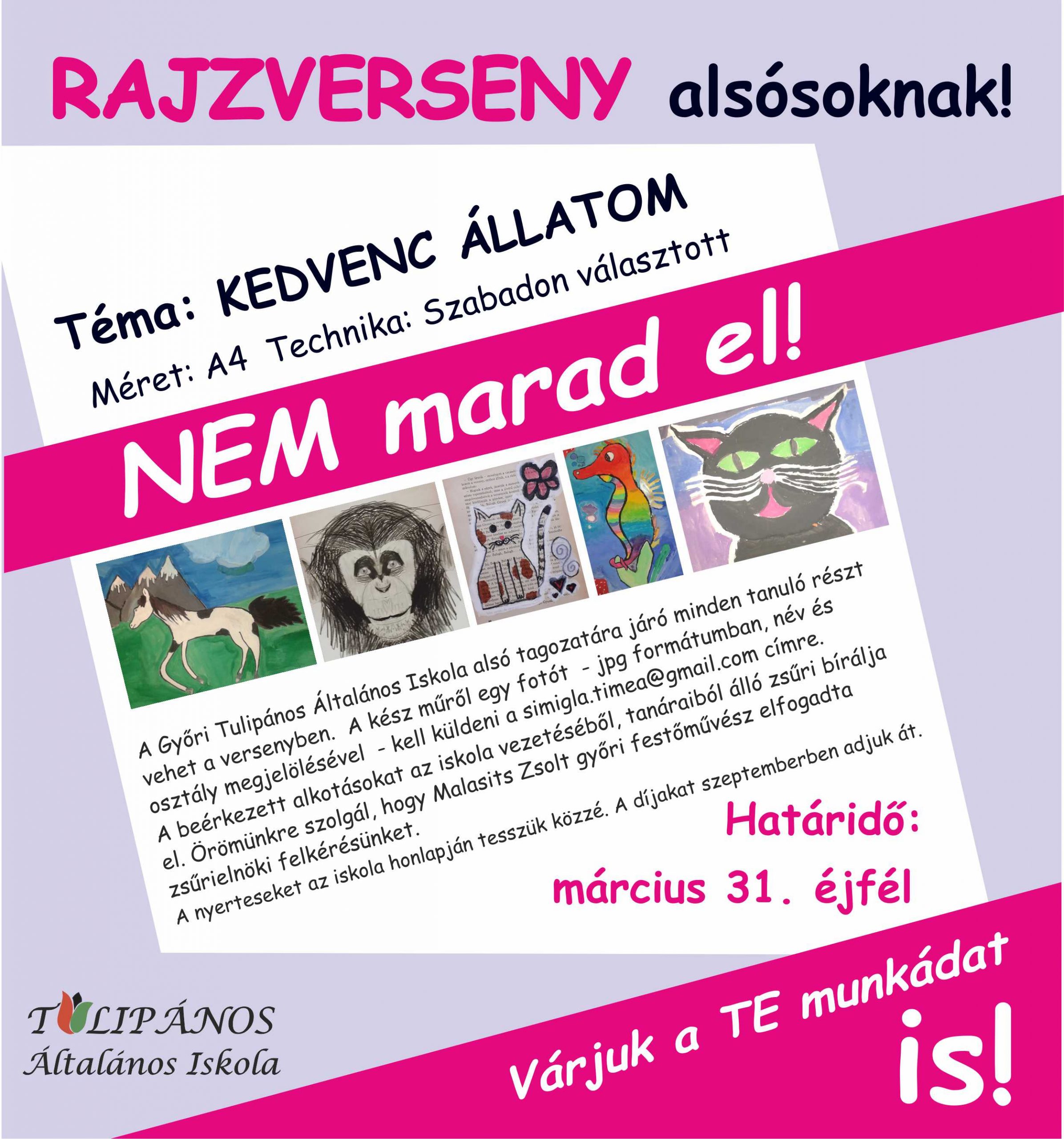 2020.03.26.A digitális munkarend ellenére sem marad el, iskolánk hagyományos rajzversenye. Örömünkre szolgál, hogy Malasits Zsolt győri festőművész elfogadta zsűrielnöki felkérésünket.