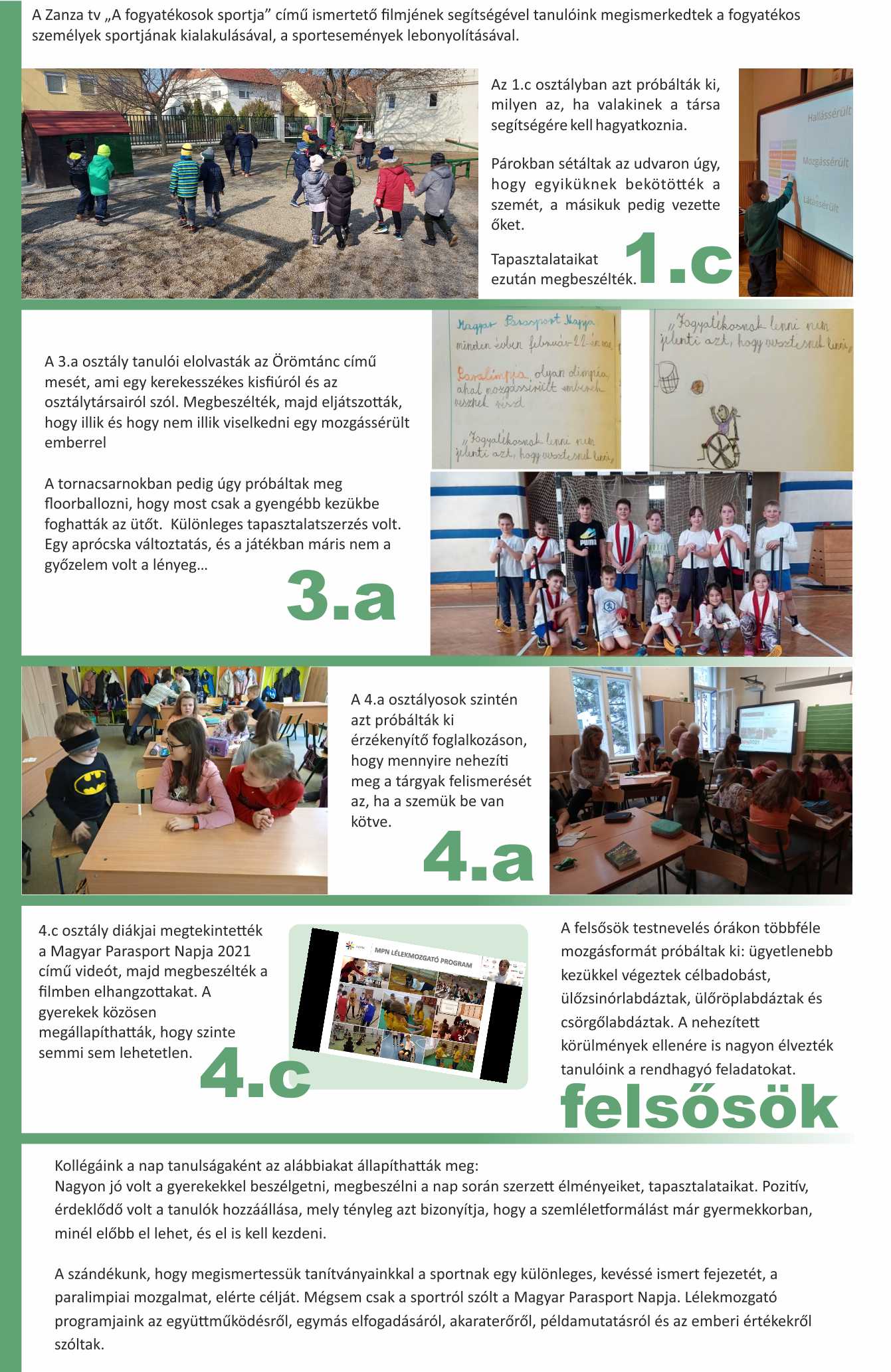 Iskolánk 2021. február 22-én – a Magyar Parasport Napján – csatlakozott a Magyar Paralimpiai Bizottság (MPB) és a Fogyatékosok Országos Diák-, Verseny- és Szabadidősport Szövetsége (FODISZ) által szervezett „LÉLEKMOZGATÓ” programhoz. A program keretében tanulóink a parasportról, a parasportolókról és a fogyatékossággal élőkről érzékenyítő elméleti -, testnevelés órákon pedig gyakorlati sportfoglalkozáson vettek részt.