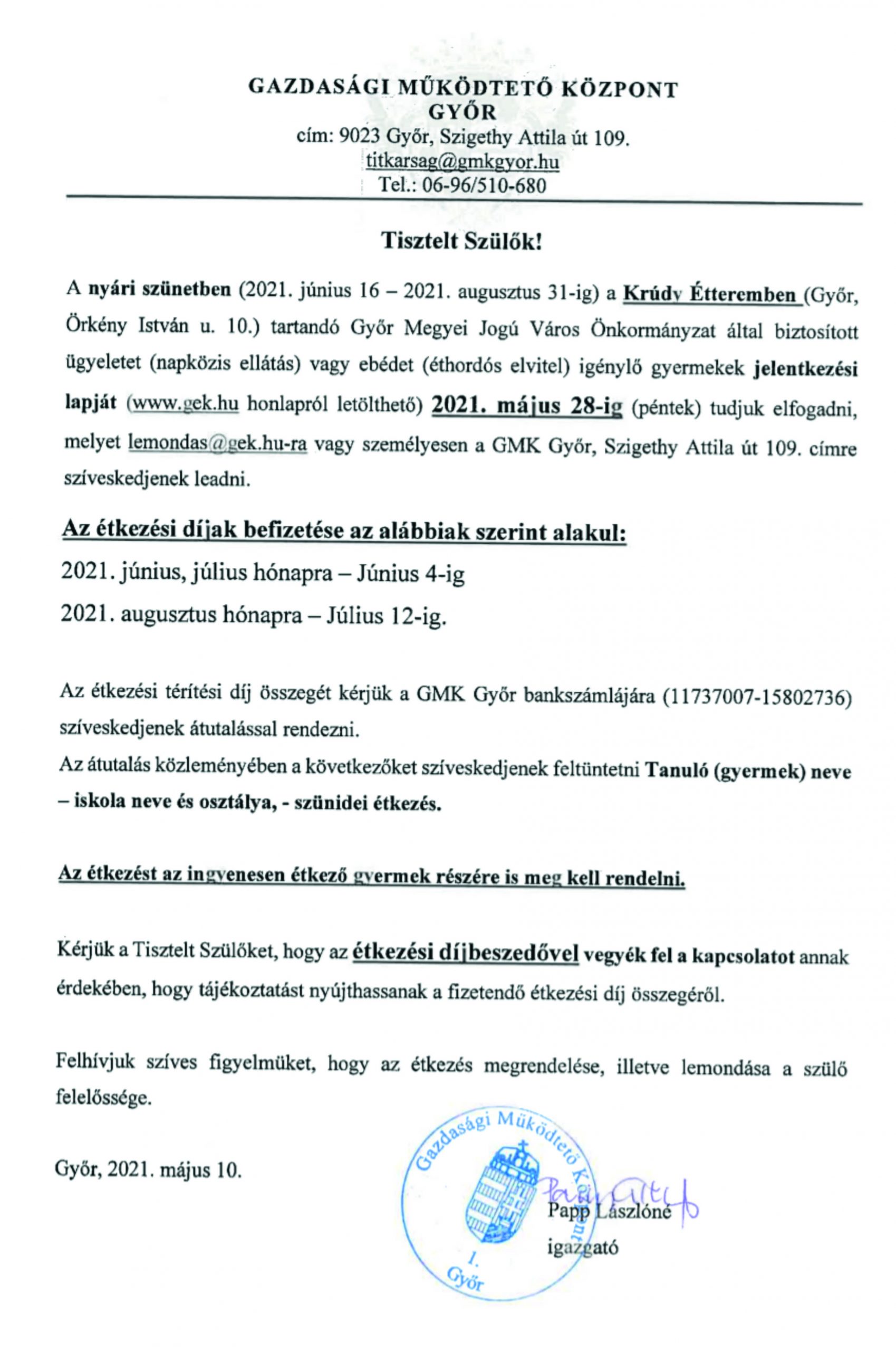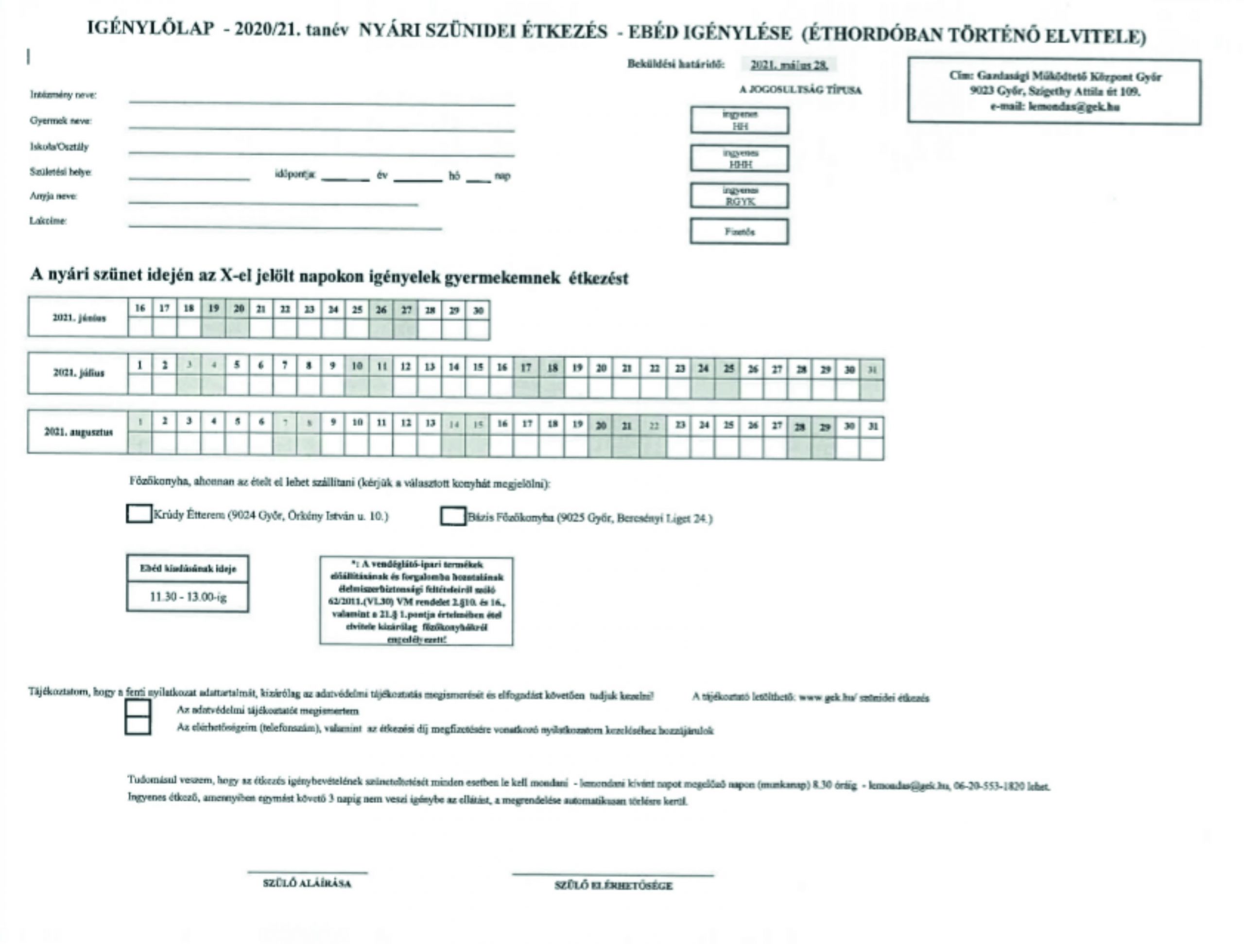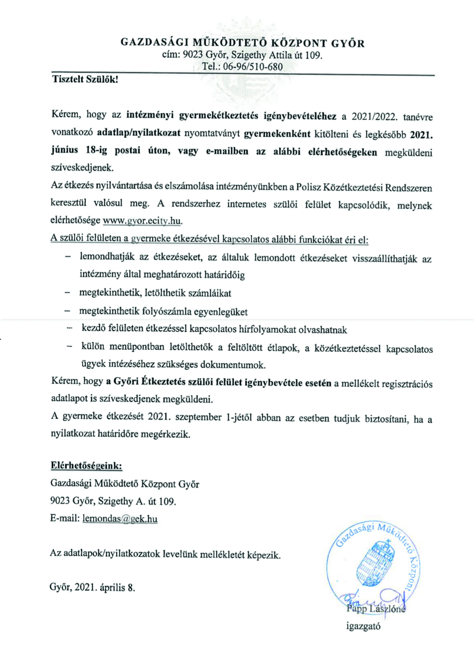 2021.05.29.A nyári szünettel kapcsolatos étkezési lehetőség, napközi ügyelet igénylése és a jövő tanévi intézményi gyermekétkeztetés igénybevételéhez szükséges adatlapok, nyilatkozatok: