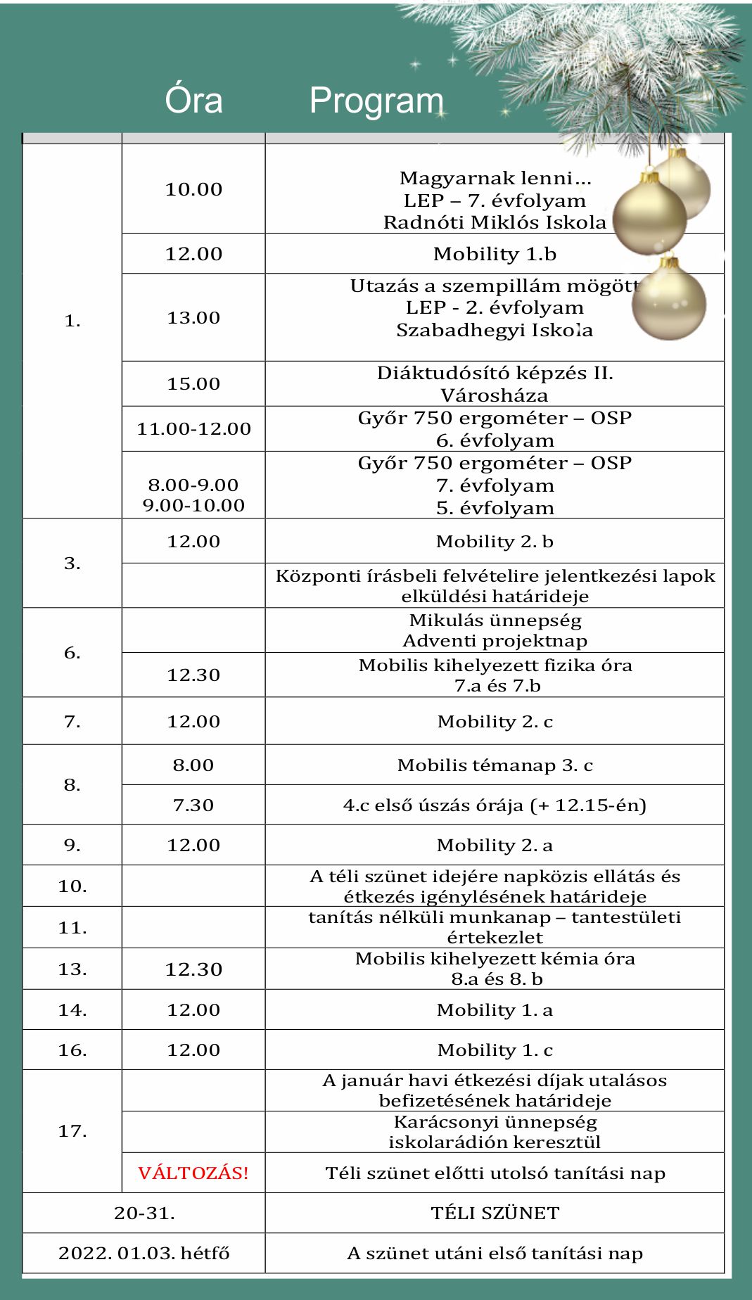 Intézményünk területére való belépés rendje2021.11.30.Ünnepekre készülünk..2021.12.12. Iskolánkban az alábbi események és programok várhatóak december hónapban: