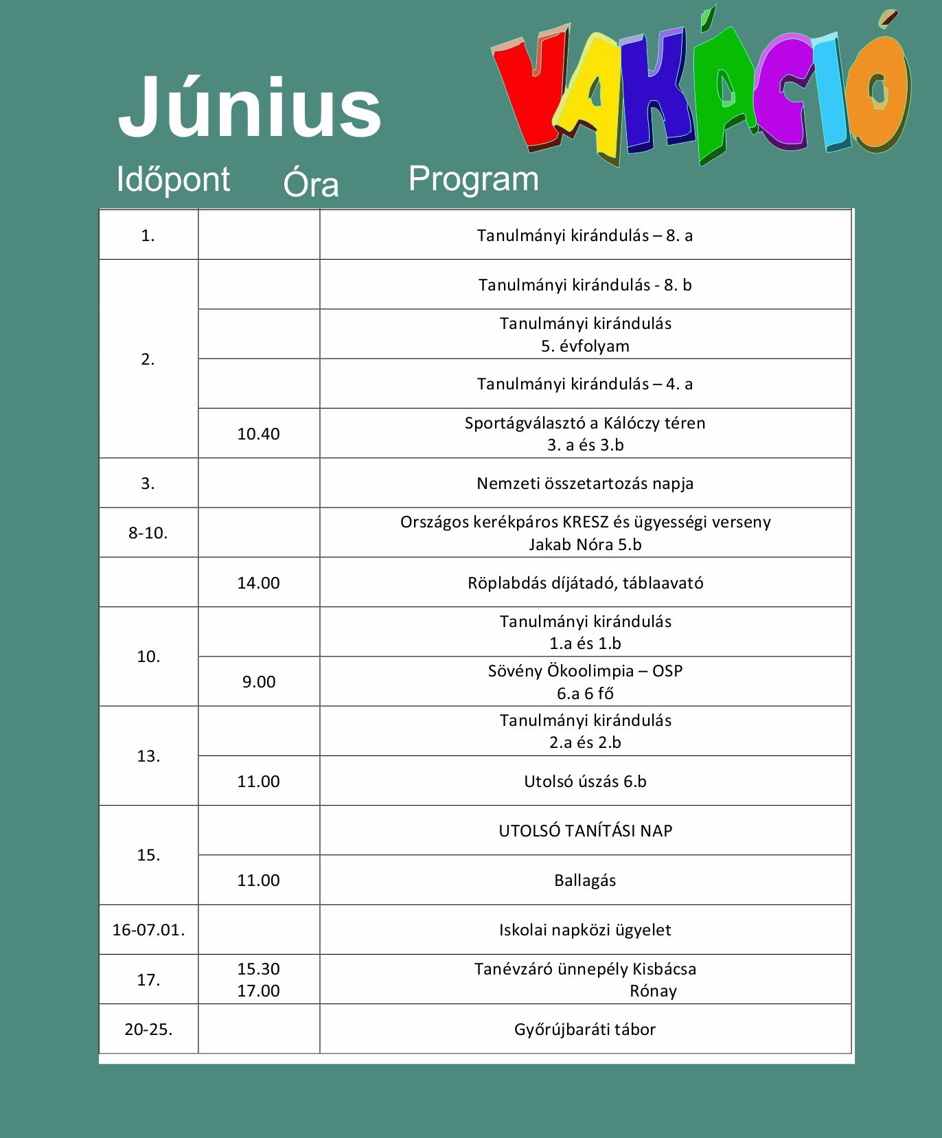 Június hónapban az alábbi események, programok lesznek intézményünkben:
