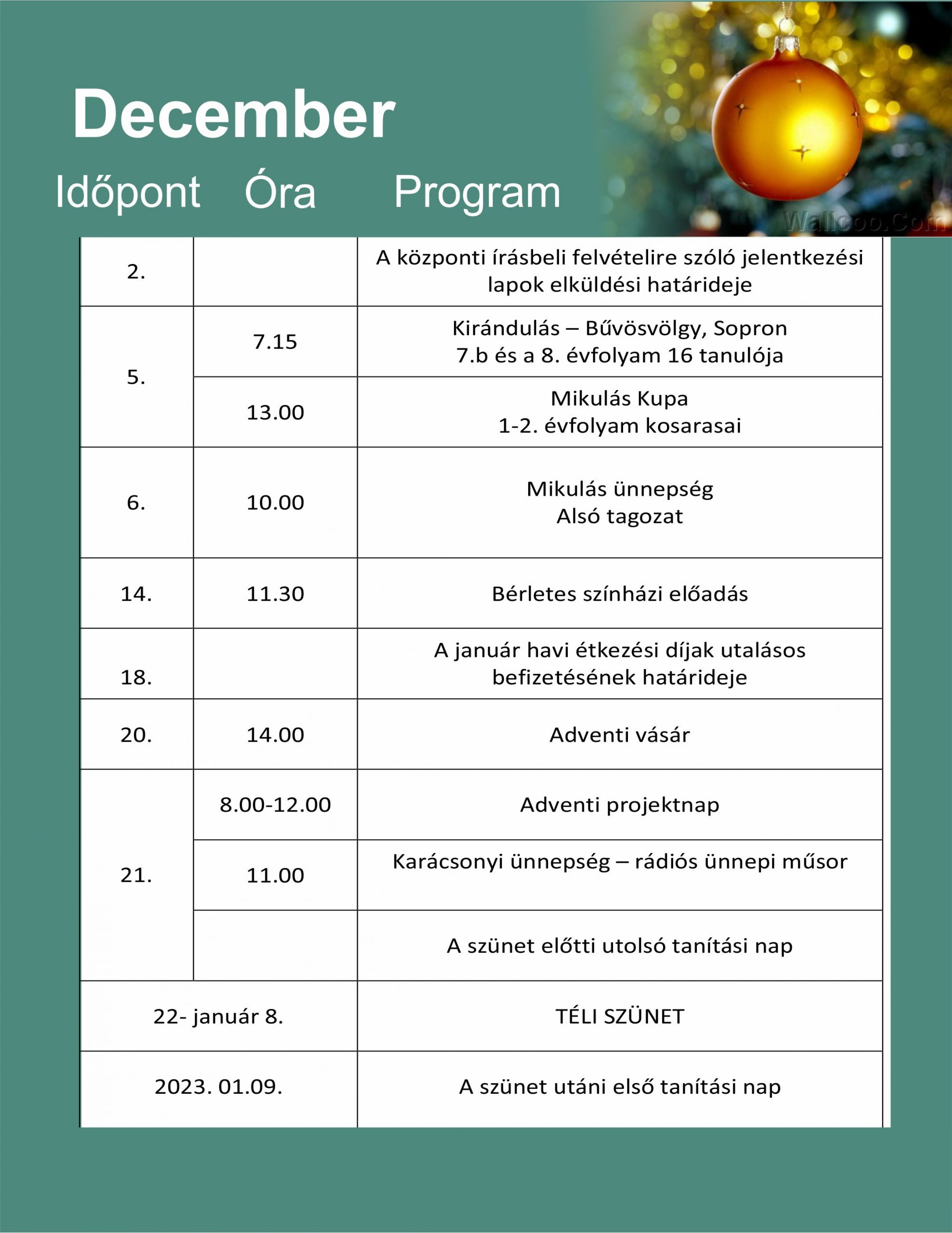 Balesetmegelőzési videó2022.11.27.Mikulás2022.12.07. Intézményünkben az alábbi rendezvények, programok várhatóak decemberben: