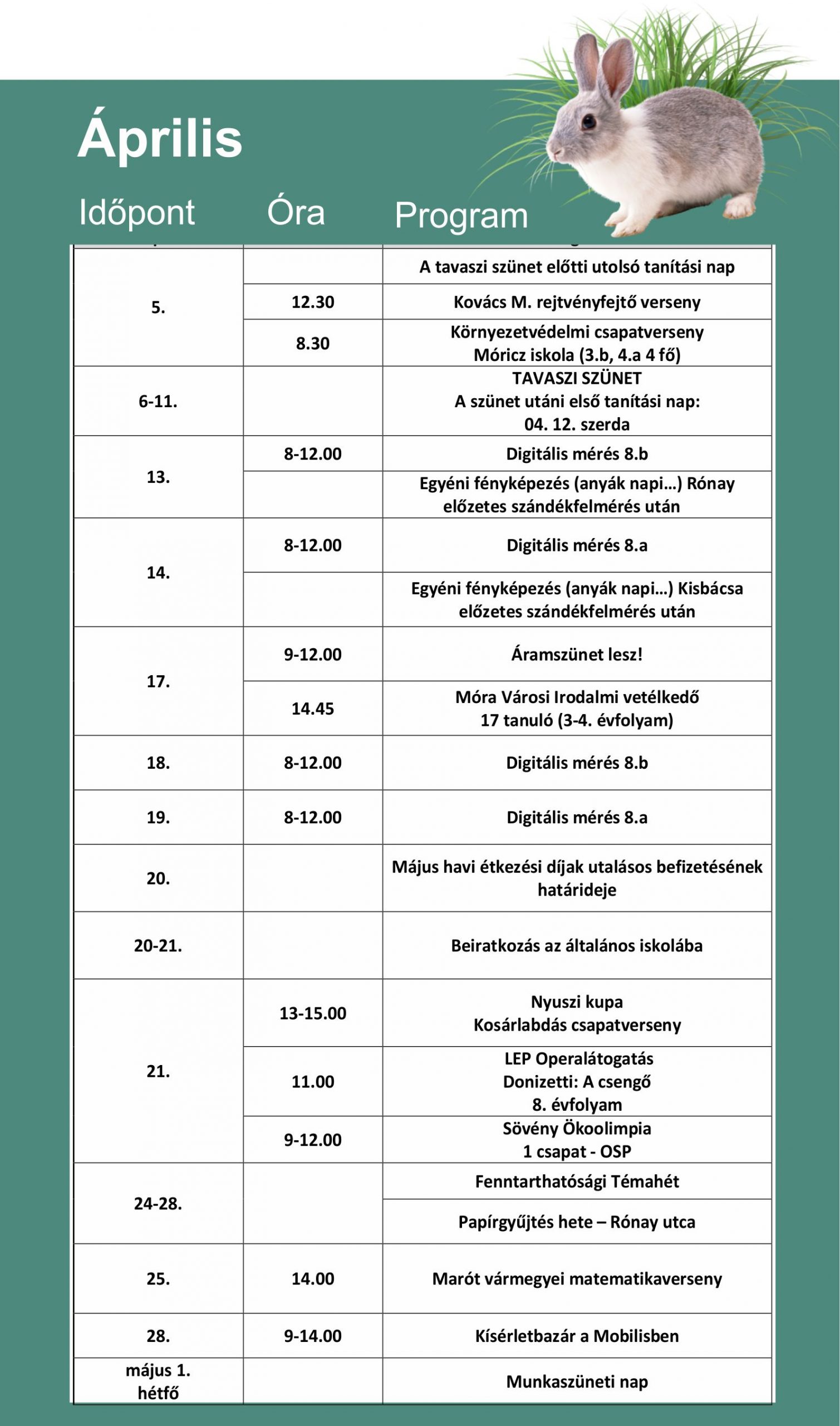Iskolai rajzverseny2023.04.01.Beiratkozás általános iskolába2023.04.04. Iskolánkban a következő események, programok, rendezvények várhatóak április hónapban: