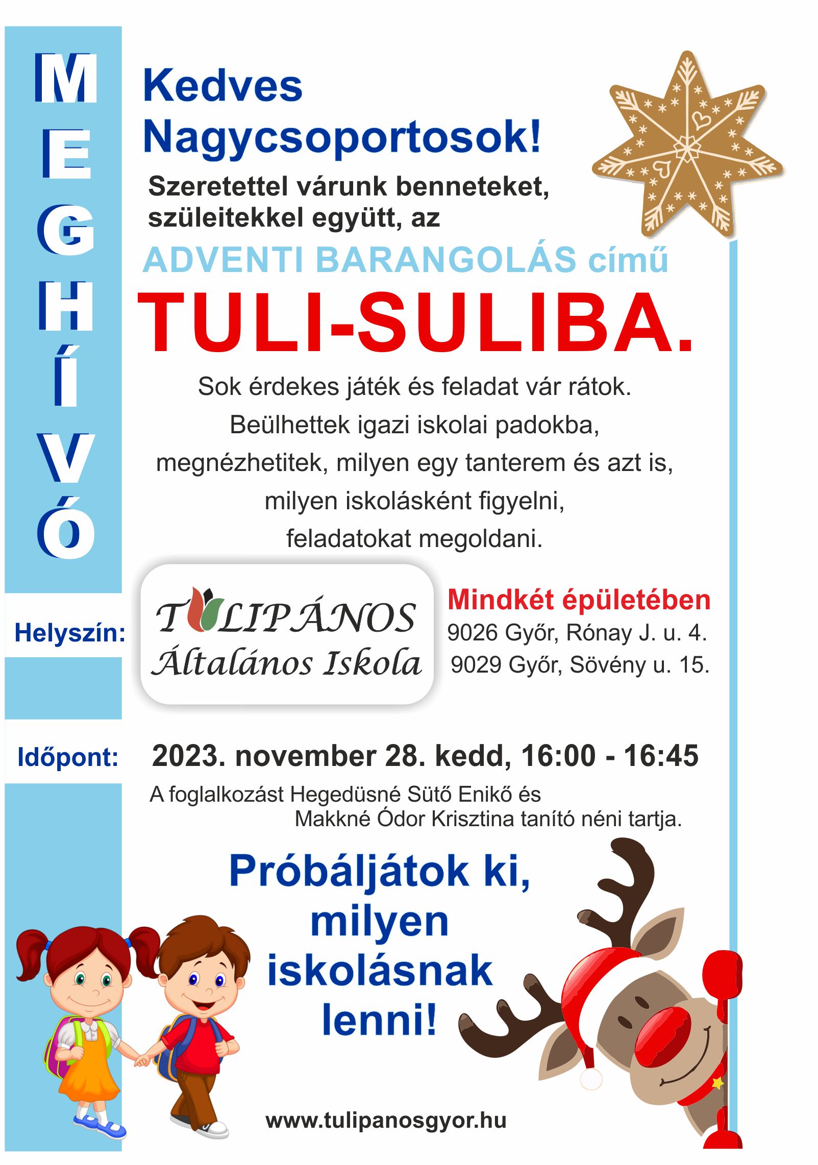 2023.11.20.Szeretettel várjuk a nagycsoportos gyerekeket szüleikkel együtt a Tuli-Suli következő foglalkozására. A leendő elsősök megismerkedhetnek a tanító nénikkel és tréfás feladatok közben bepillantást nyernek az iskolai életbe.