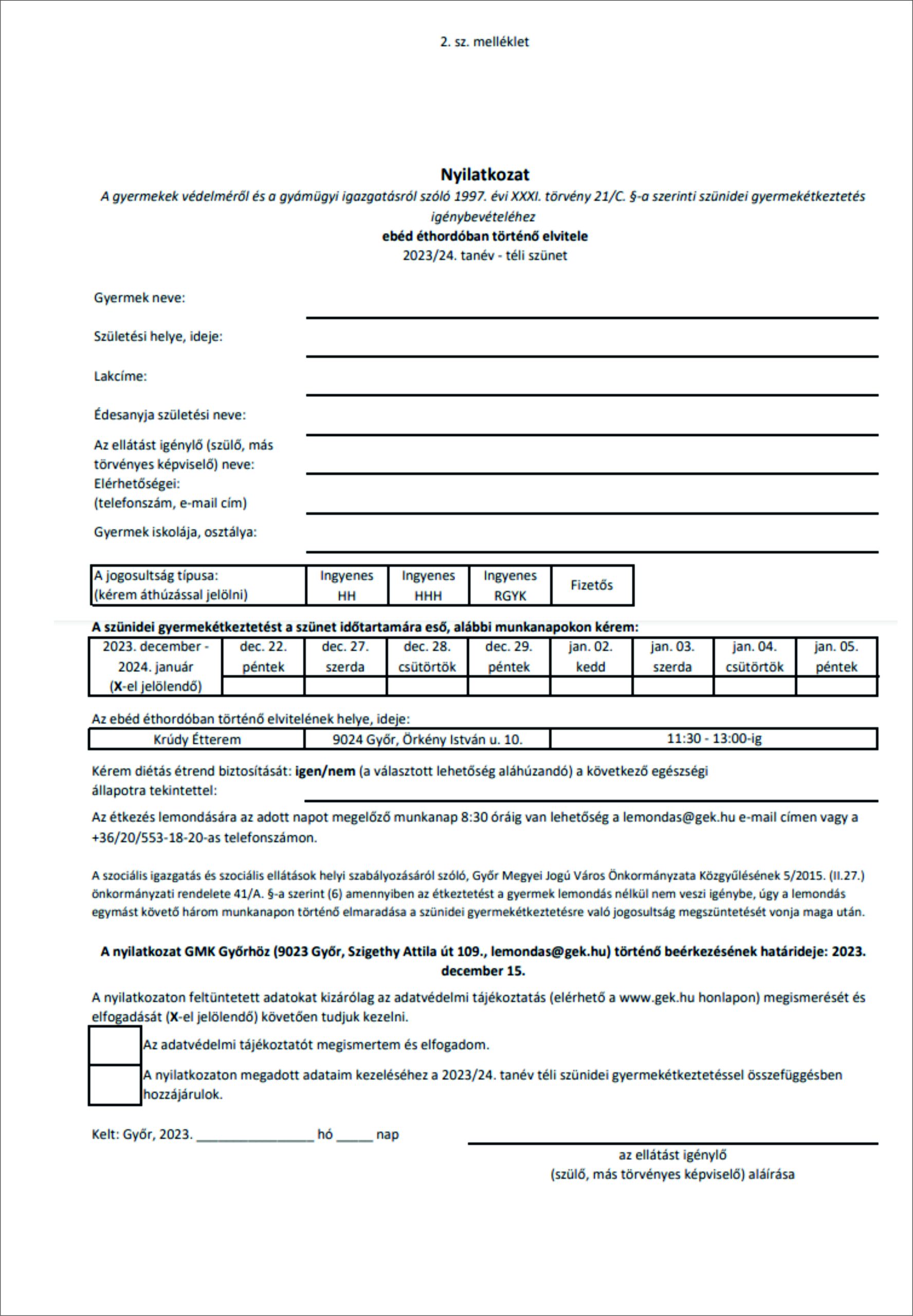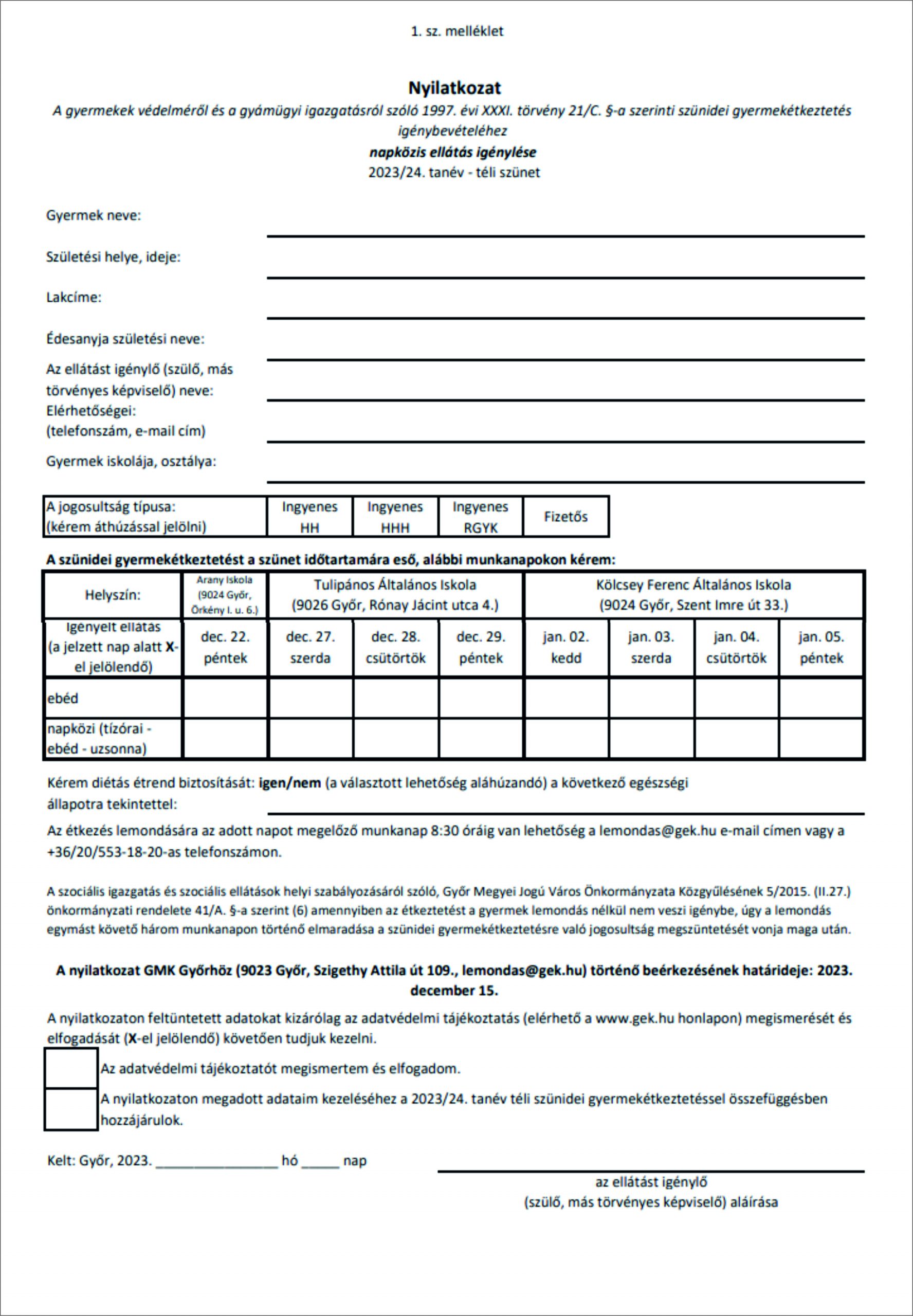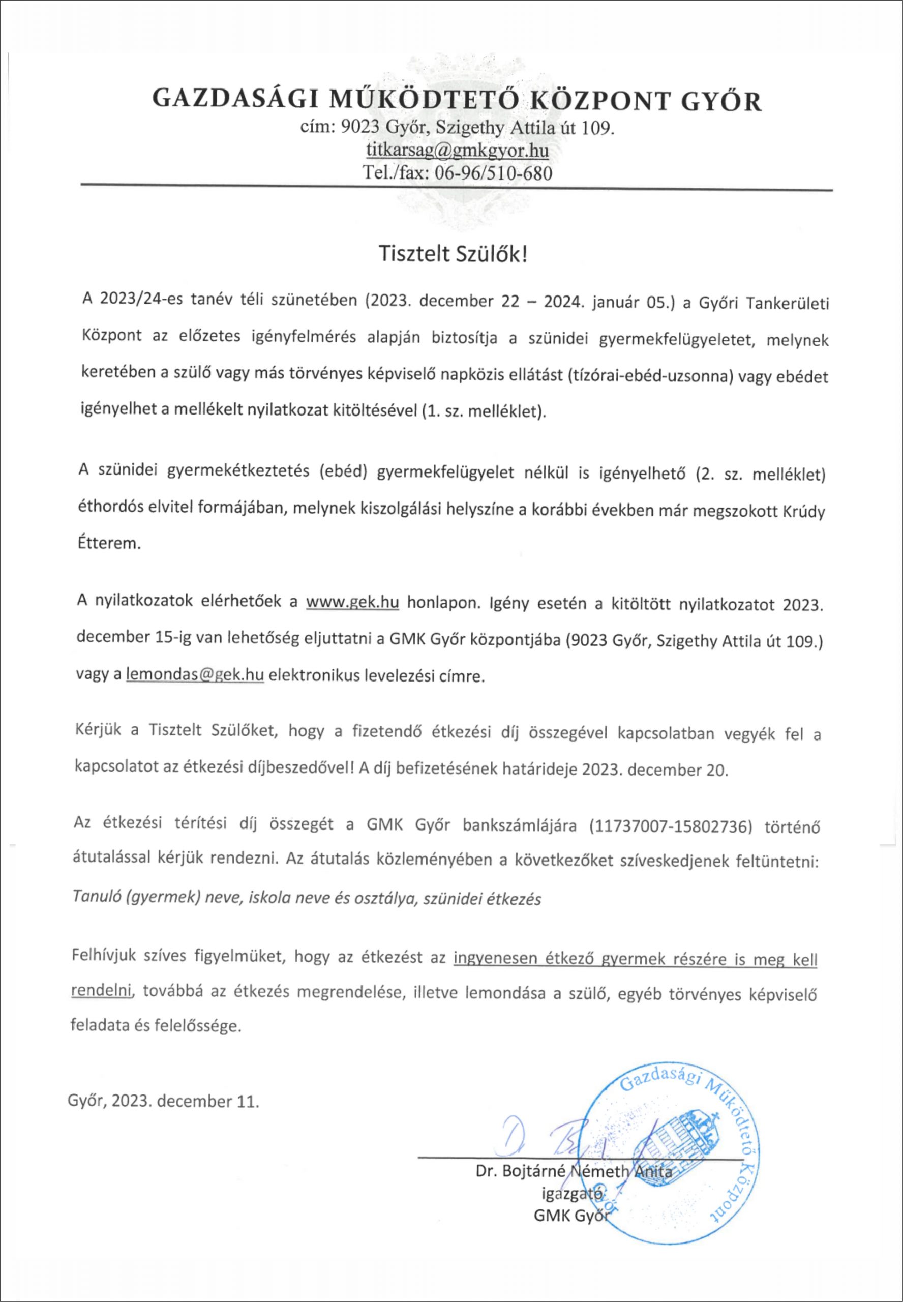 Hozzánk is eljött!2023.12.07.Mikulás Kupa2023.12.15. A 2023/24 tanév téli szünetében az alábbiak szerint igényelhető étkezés és gyermekfelügyelet:
