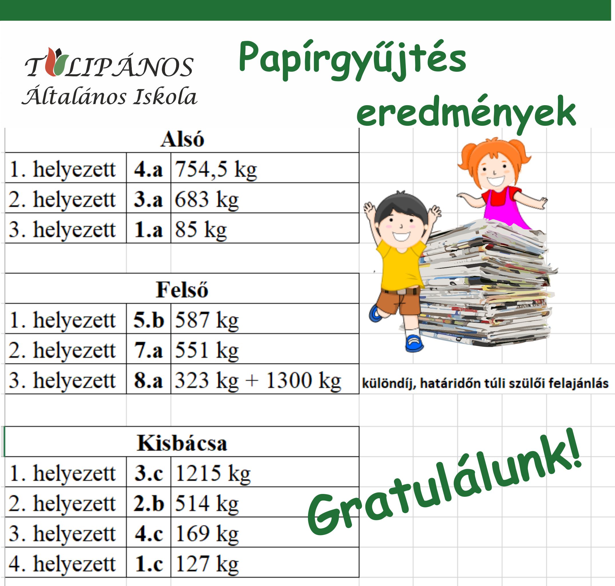 Idén is megszerveztük őszi papírgyűjtésünket a Rónay úti épületben november 13-17-ig, Kisbácsán november 20-24-ig. A gyermekek, a szülők és a pedagógusok is lelkesen vettek részt Öko iskolás akciónkban. Mindenkinek köszönjük a támogatást és külön köszönjük Tunyogi Emőke édesanyjának, Szentgyörgyi Kingának, hogy mérleget biztosított a verseny lebonyolításához!