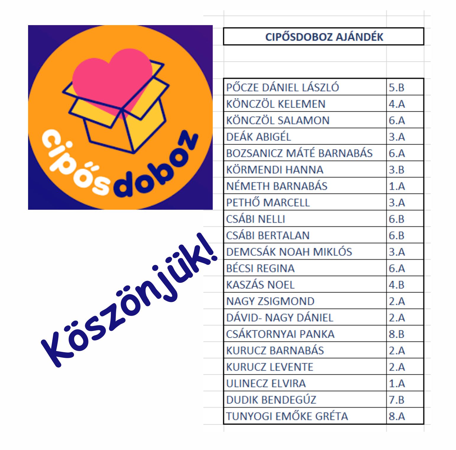Köszönetet szeretnénk mondani Hegedüsné Sütő Enikőnek , mert nagyon szépen összefogta a kezdeményezést , továbbá a szülőknek és a gyermekeknek, akik adományaikkal hozzájárultak az akcióhoz.