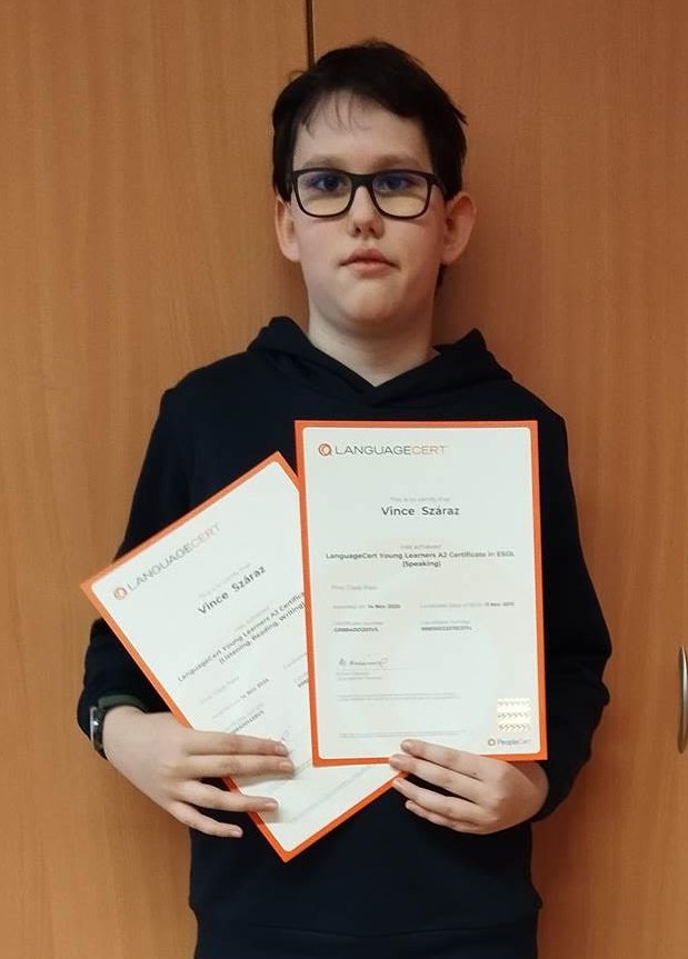 Január2026.01.03.Február2026.02.01. Száraz Vince 6.b osztályos tanulónk angol nyelvből A2-es bizonyítványt szerzett. Gratulálunk!